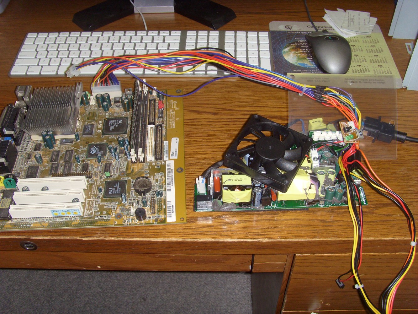 Here are a couple more pictures. First is half way through the wiring. Second is plugged into an old PC in case of any accidents. And last is next to a normal PSU case for size comparisons. The PSU itself is 3.25" x 2.5" x 8.25".