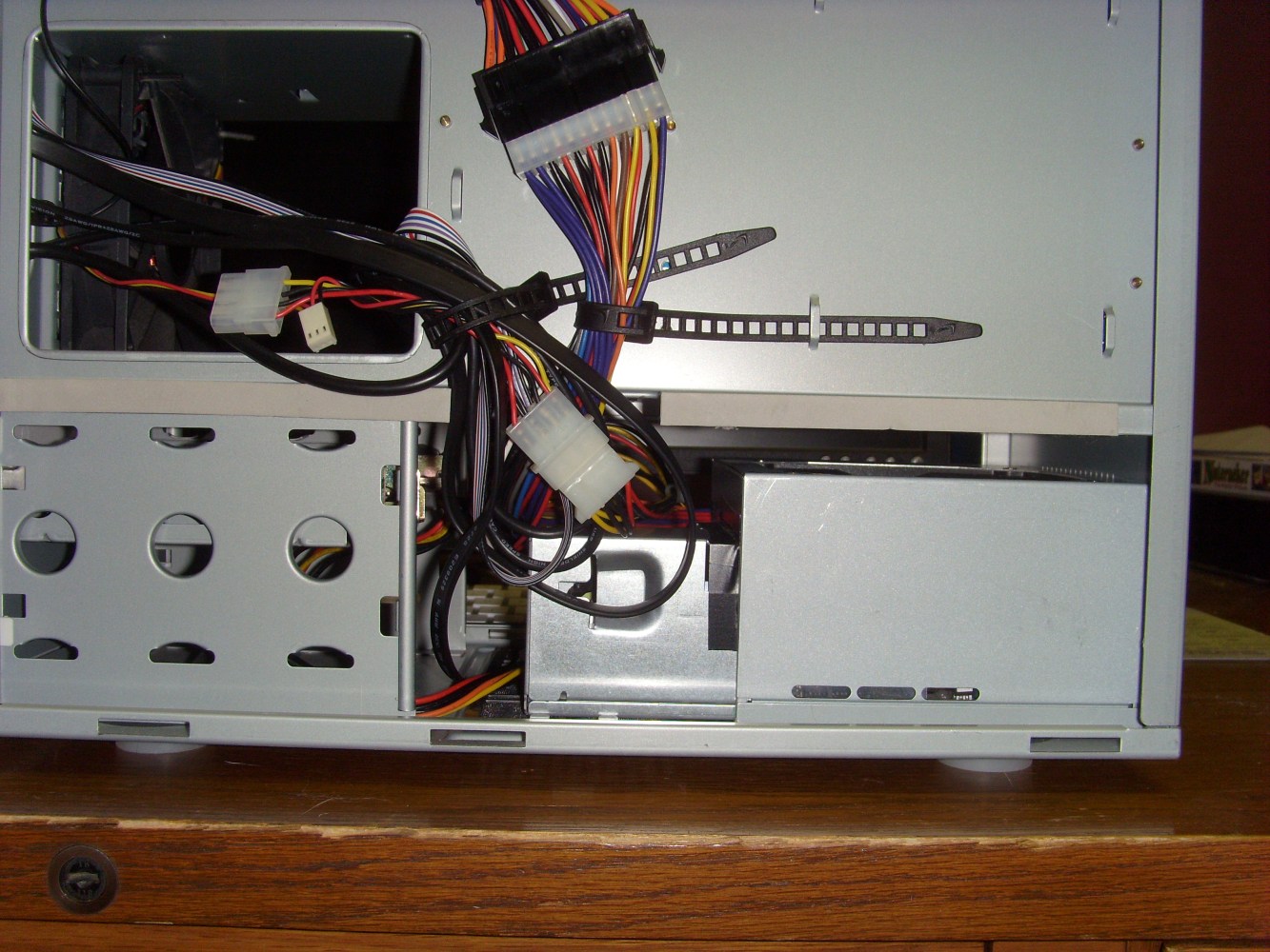 Alright, final testing with this thing from me. I put it in my desktop PC which is in a mini-P180 case. It fit fine. The extra length part covered part of the bottom vent. But being that the case is on carpet, I don't think anything gets in that way anyways. I needed an ATX extension previously so no issues reaching that. The P4 cable even with the extension couldn't reach around the back so I had to go around the video card and over the motherboard. Could just get a longer extension. We'll see. Only needed one molex for the 5V Yate Loon fan on the front and one SATA for the Super Talent SSD right there next to the PSU. No cable length issues there. I did end up switching the fan for a Scythe S-Flex (1200rpm one) and it always starts and spins very slowly. Here's a couple pictures...